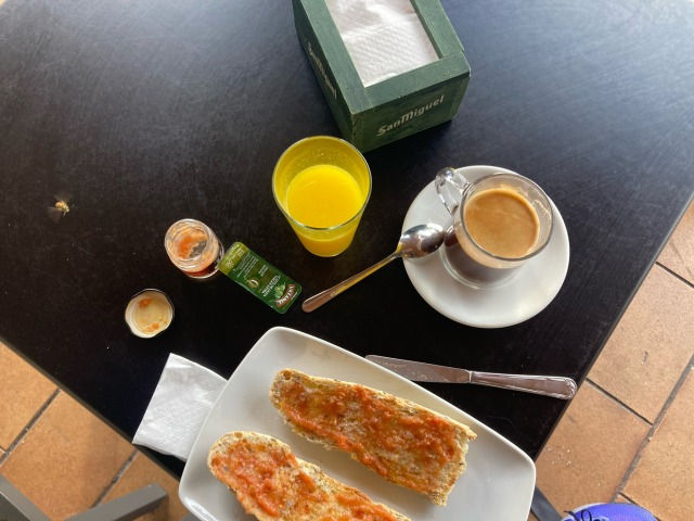 The breakfast is disappointing and – at €6,45 – more expensive than I would’ve paid at the albergue. It is possible to have €2,50 breakfasts in Spain, but not healthy ones. €2,50 will usually get you a cafe con leche and bread with jam or a sweet pastry – tasty, but not exactly the breakfast of champions. Lots of cream and sugar there. Then again, maybe walking this much none of that matters. Still it’s hard for me to unlearn a lifetime of being taught that you need to eat sauerkraut, knäckebröd and kale every day or your body will FAIL. Thank you, #SwedishMother.